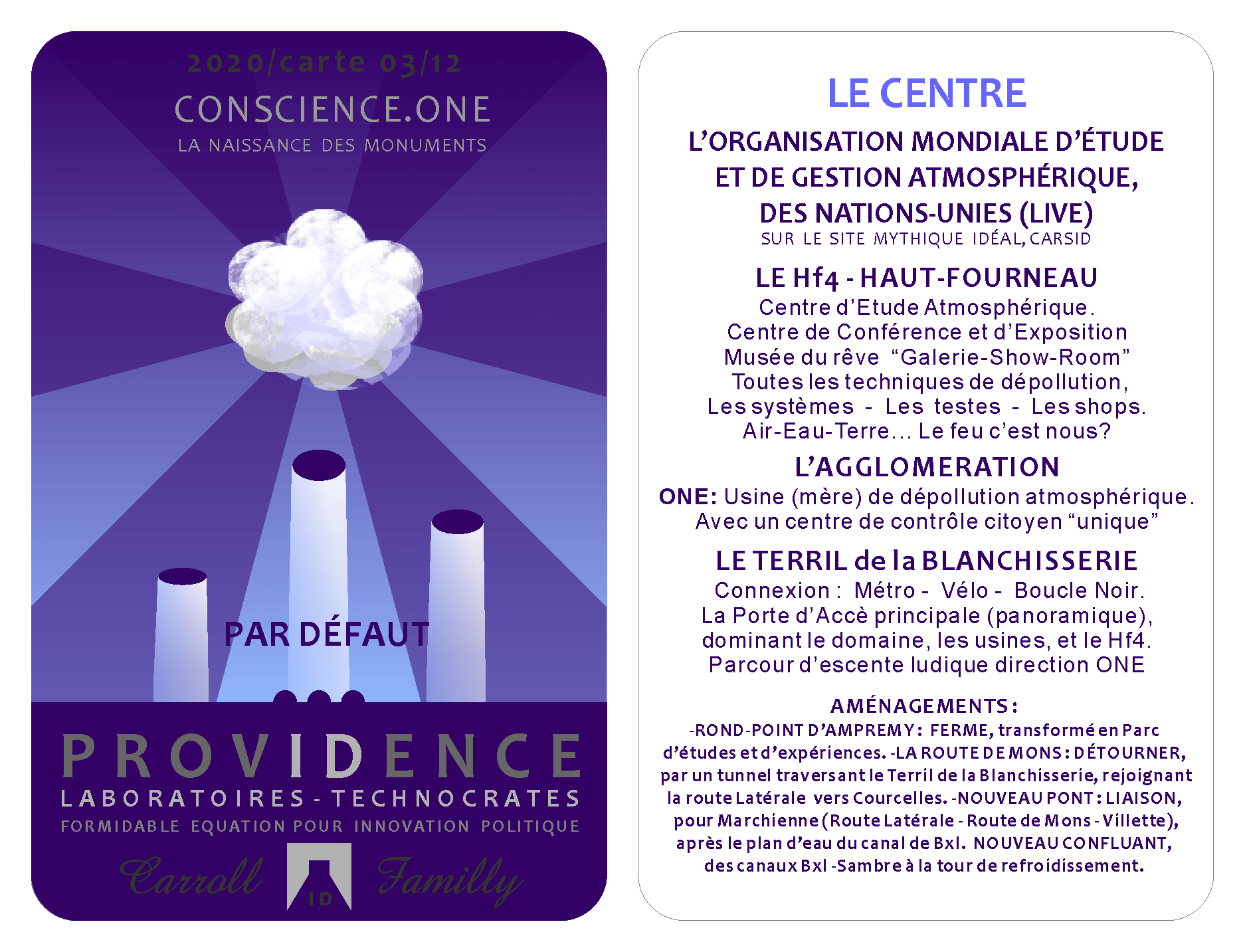 La première usine au monde à dépolluer l'air dans l'atmosphère. Avec un coefficient de rentabilité maximum, unique ! Cette usine, méga/machine, nommée CONSCIENCE-ONE, est actionnée par l’impulsion du public, conscient d'agir pour le futur, sous la bannière